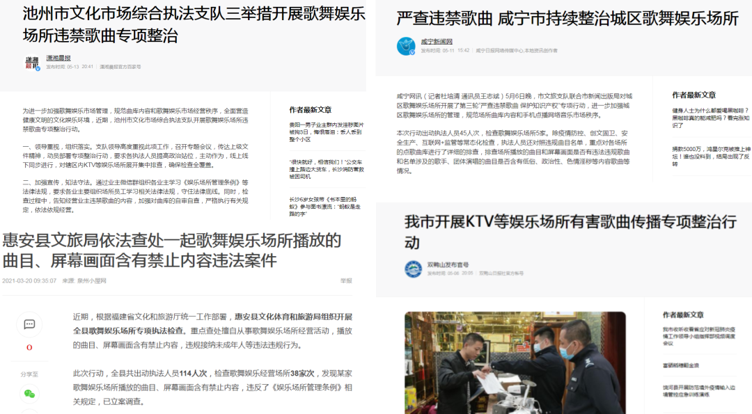 池州市、咸宁市、惠安、青田、丹江口等多地开展KTV等娱乐场所有害歌曲传播专项整治行动。