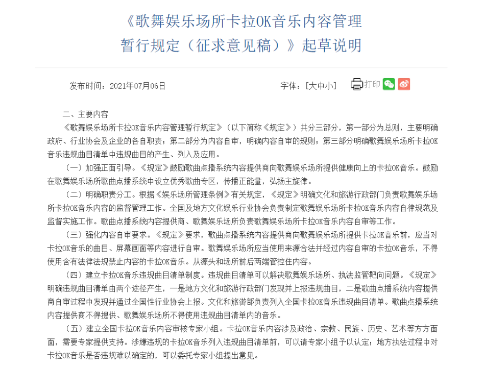 近日,为加强歌舞娱乐场所内容管理,文化和旅游部发布公告,就《歌舞娱乐场所卡拉OK音乐内容管理暂行规定(征求意见稿)》。