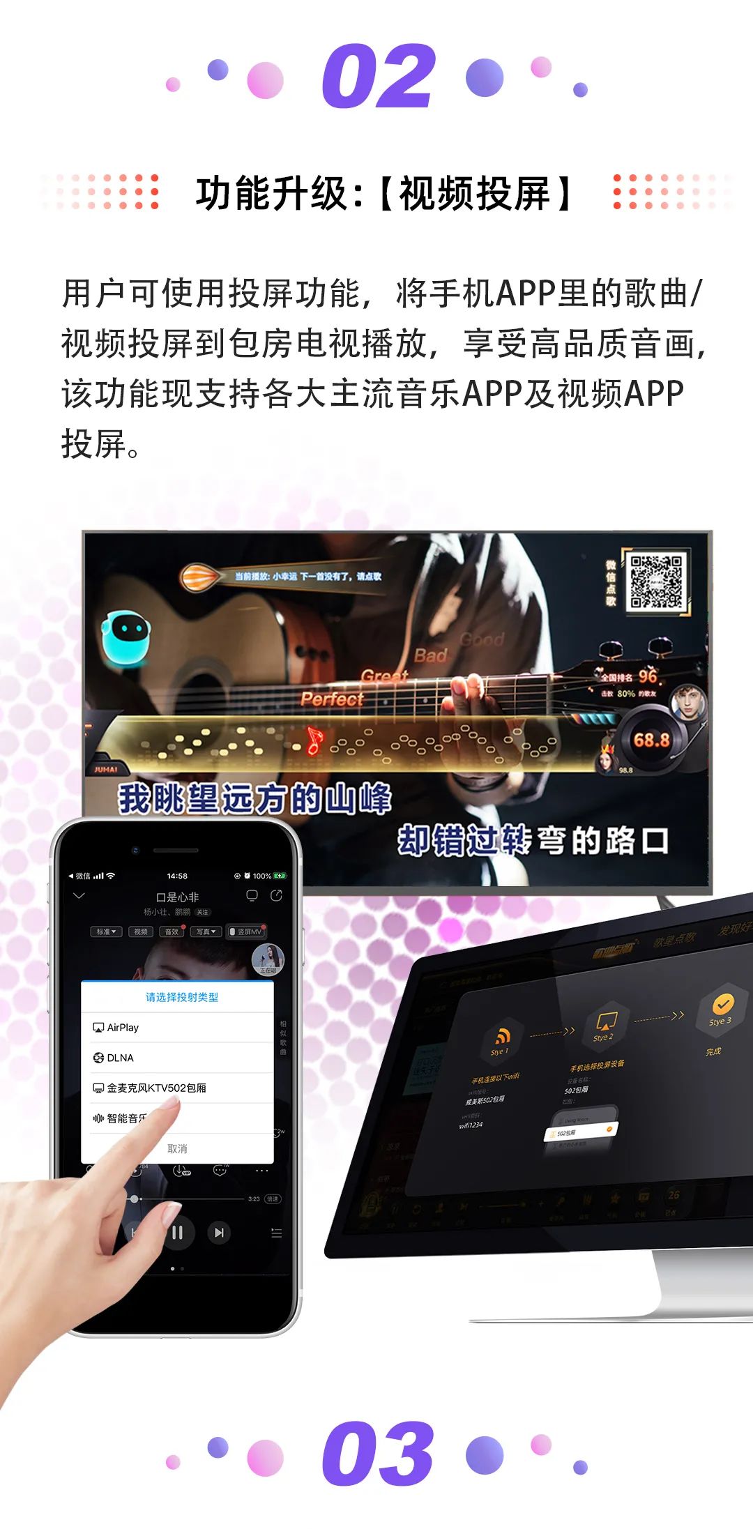 功能升级视频投屏,支持用户将手机里的歌曲、视频投放到包房电视上播放