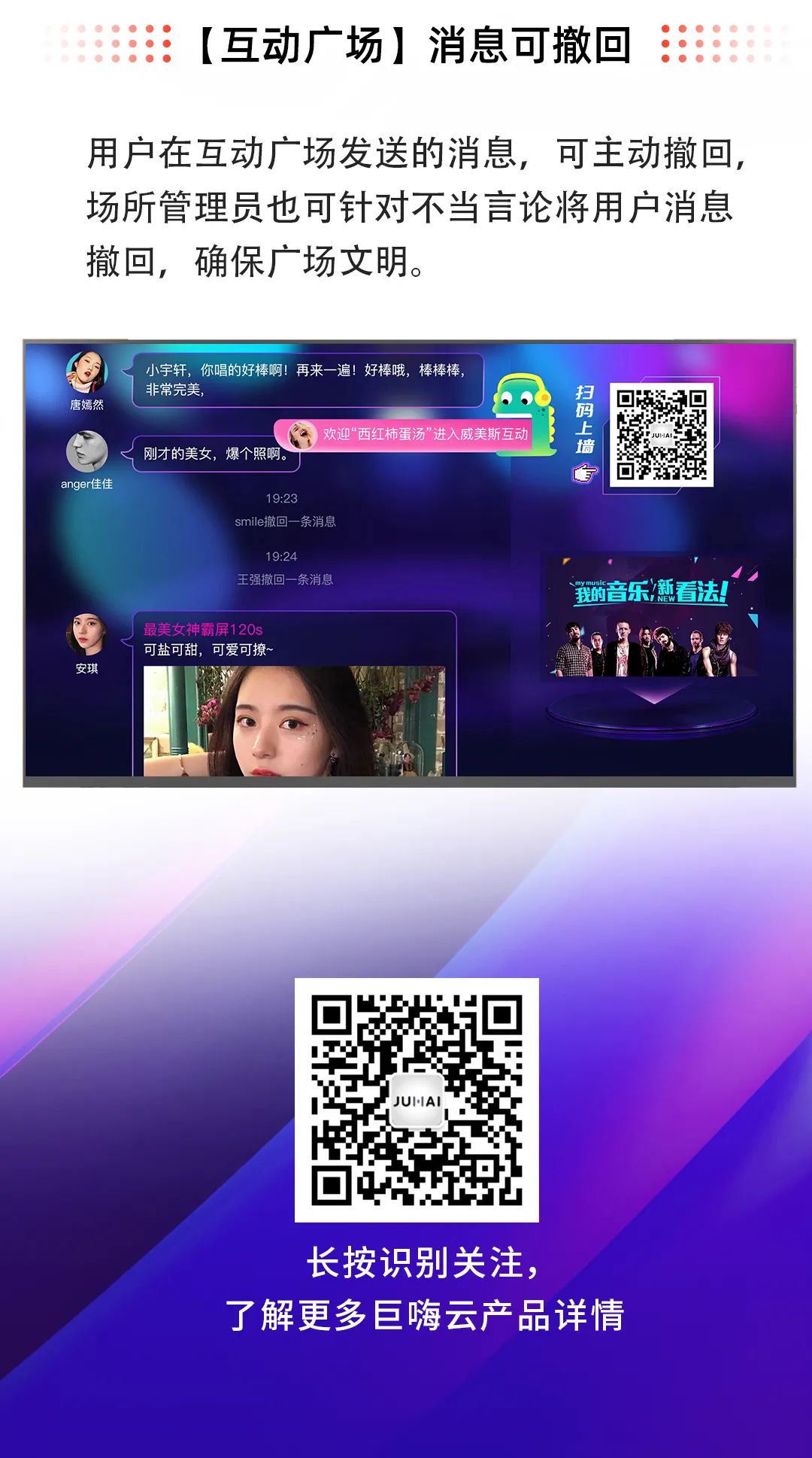 互动广场消息可撤回,可主动撤回,管理员也可针对不当言论进行撤回,确保广场文明
