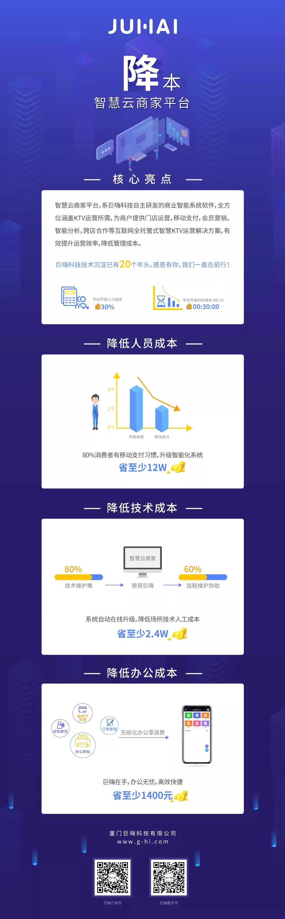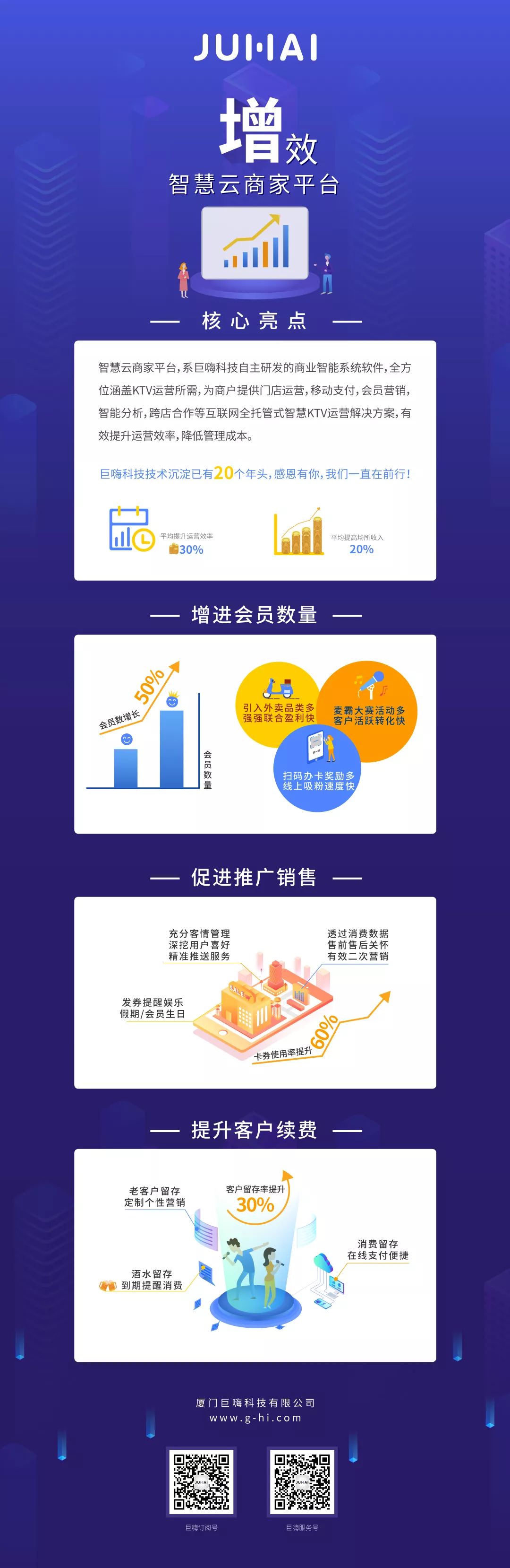 巨嗨智慧云商家平台,系巨嗨科技自主研发的商业智能系统软件,全方位涵盖KTV运营所需,为商户提供门店运营、移动支付、会员营销、智能分析、跨店合作等互联网全托管式智慧KTV运营解决方案,有效提升运营效率,降低管理成本。