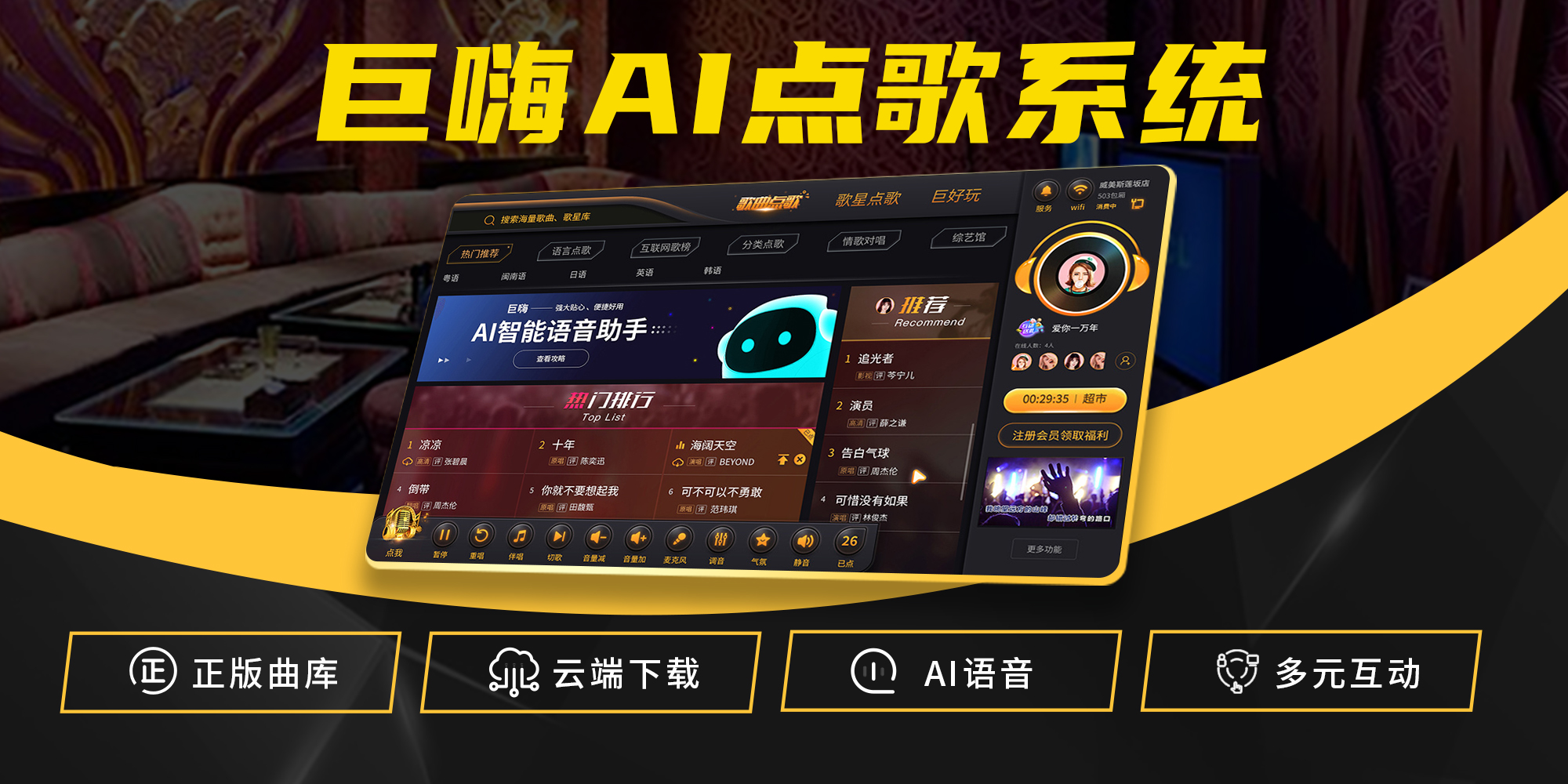 巨嗨智能AI点播系统,摒弃传统本地服务器架构,采用云端部署,去除机房及维护人员投入,大幅节省运营及维护成本,支持歌曲自动更新,新歌实时下载,实时唱支持歌曲内网共享技术,每个包厢机都是“服务器”。
