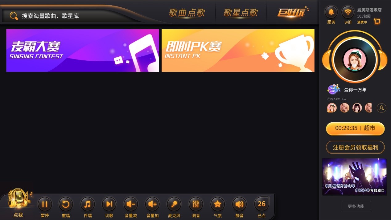 这个答案是肯定的,在巨嗨AI智能点播系统使用上,最受00后欢迎的便是PK赛,无论是【麦霸大赛】、【实时约战】还是【即时PK】,竞技的PK,加上丰厚的现金红包奖励,都让这群年轻人再次燃起来唱K热情。